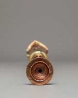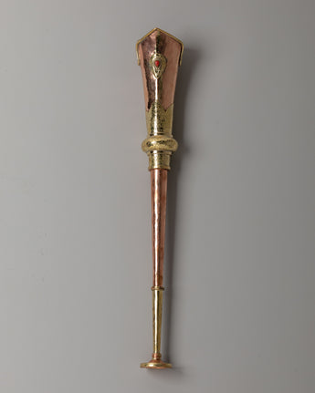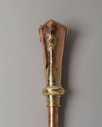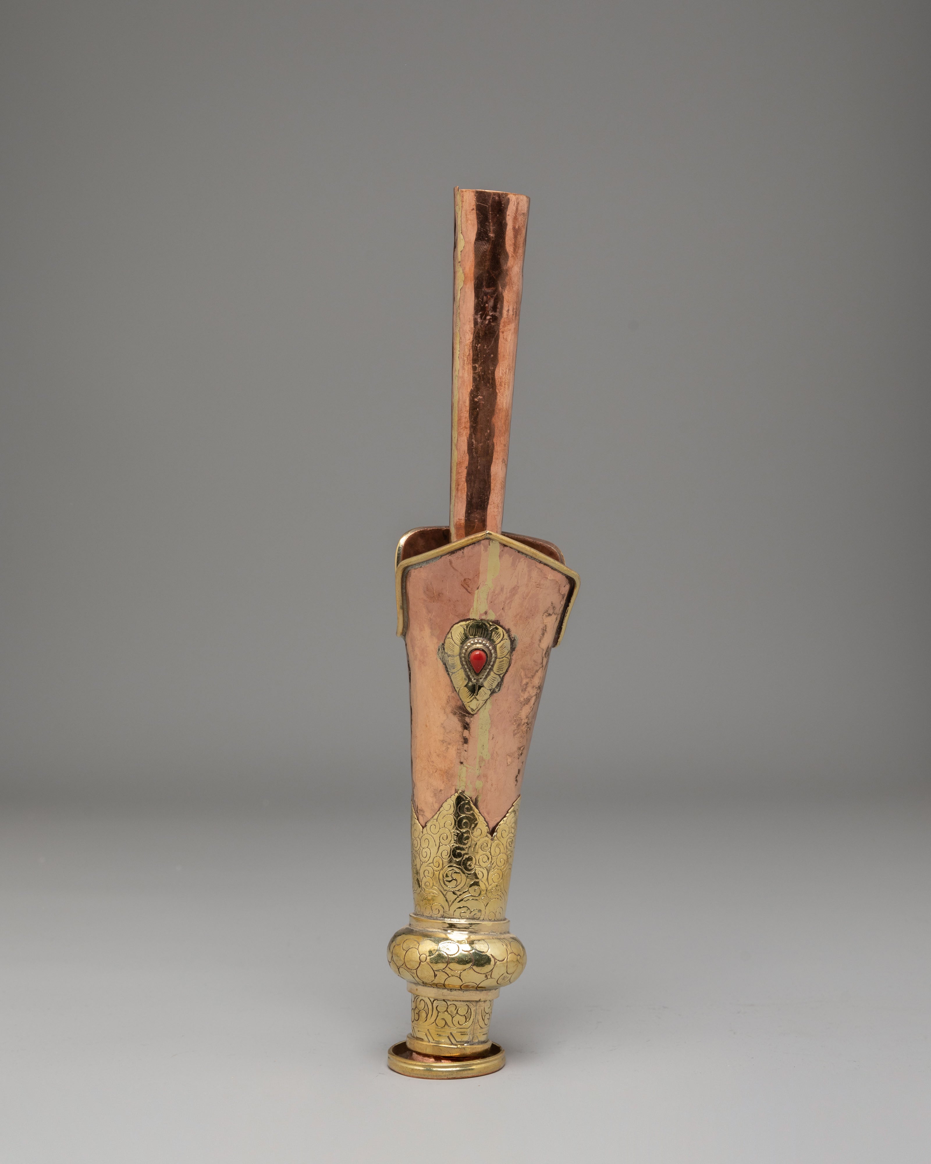 The design of the Tibetan Kangling combines traditional craftsmanship with deep symbolic meaning. The gold-plated accents accentuate the ritual significance of the instrument, while the coral stone symbolizes vitality, protection, and healing. The shape of the Kangling is crafted explicitly for resonance, ensuring that its sound is clear and profound when used in ceremony. The intricate detailing on the upper section, with its symbolic motifs, enhances the spiritual significance of this instrument, making it a key tool for practitioners seeking to deepen their ritual work or connect more deeply with the spiritual realm.