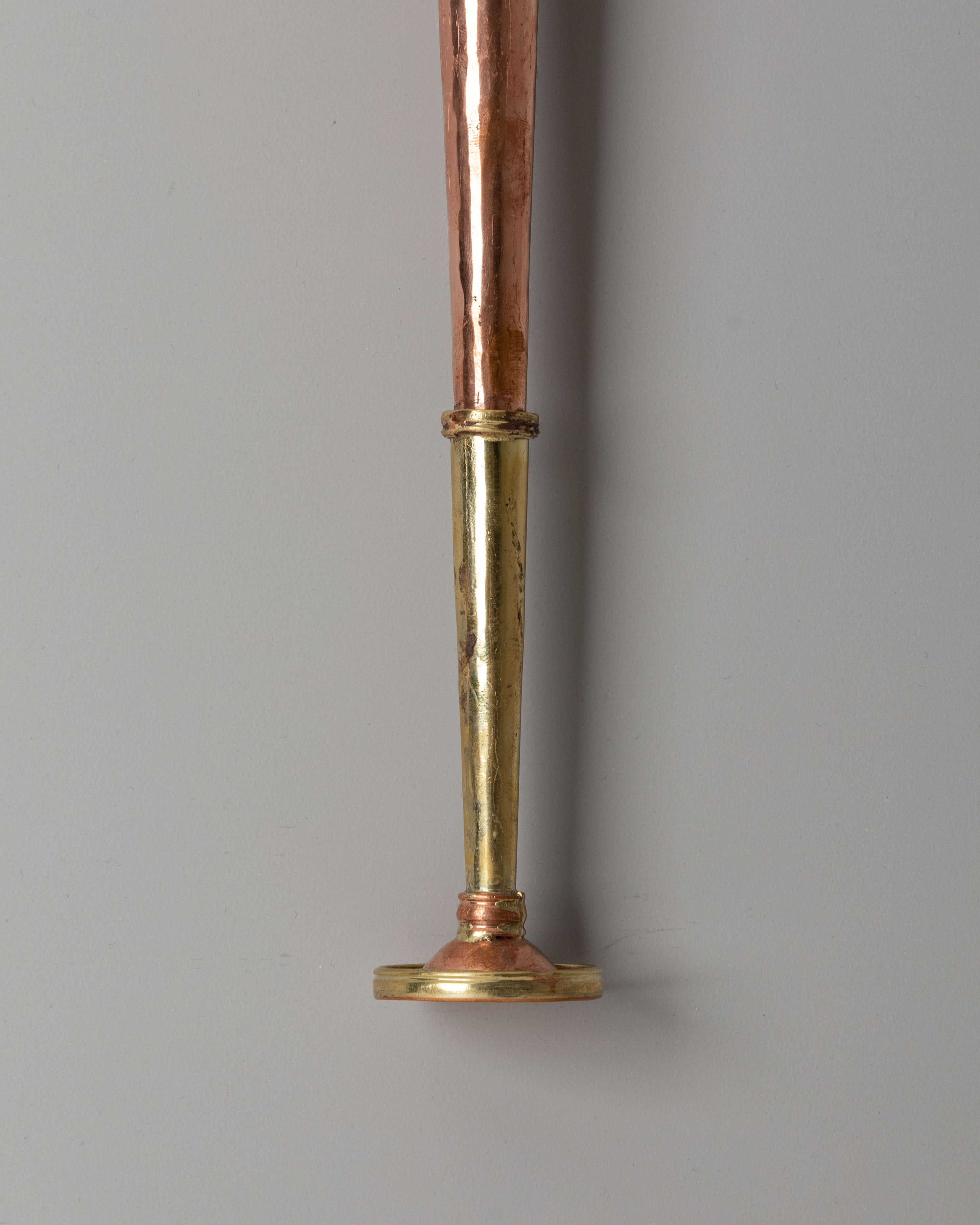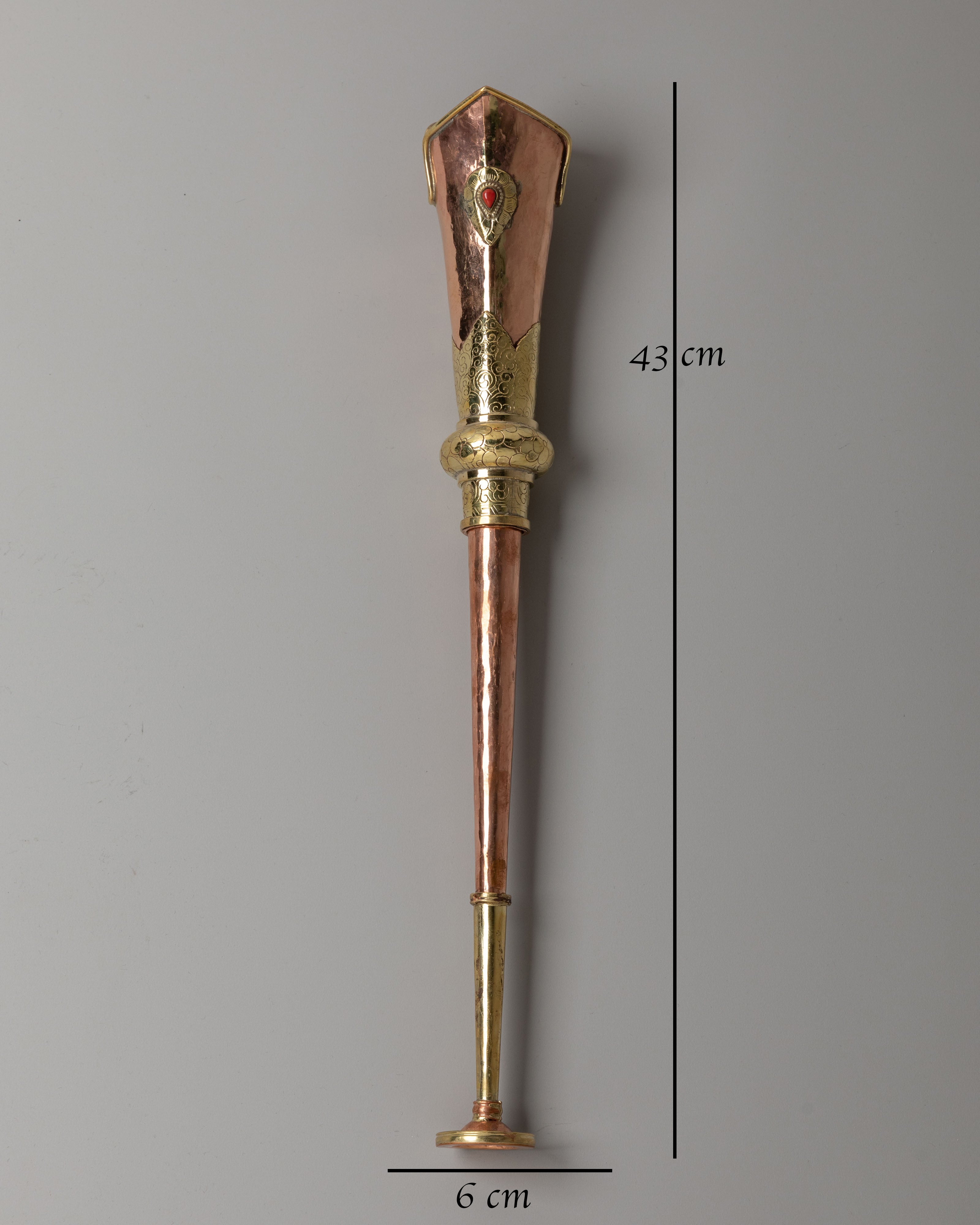 This Tibetan Buddhist Kangling is a traditional ritual trumpet used in Tibetan Buddhist ceremonies and spiritual practices to invoke deities, clear negative energies, and deepen meditation. Standing at 43 cm in height and 6 cm in width, this beautifully crafted kangling is made of white metal with gold plating and features a coral stone at the top. The Kangling is revered in Tibetan Buddhism for its powerful sound, which is believed to purify the space and assist in spiritual transformation during sacred rituals and offerings.