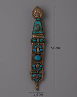 The Tibetan Buddhist Knife is meticulously made on a copper body and brilliant silver plating. This combination of materials increases the knife's longevity and adds to its outstanding aesthetic appeal. Coral and turquoise stones are inlaid into the handle, chosen for their cultural value and spiritual meaning in Tibetan Buddhism.