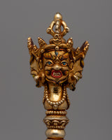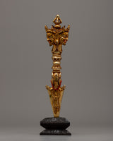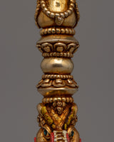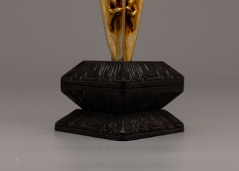With the help of our magnificent Tibetan Buddhist Phurba, discover the deep secrets of Tibetan Buddhism. This sacred ritual item is made entirely of copper, carefully crafted by hand with devotion, and lavishly plated in gold, which stands for enlightenment and purity. With a height of 31.5 cm, it is a powerful focal point for spiritual activities that demands respect and attention.