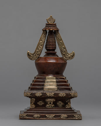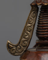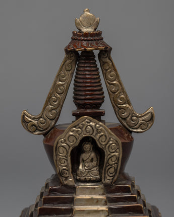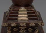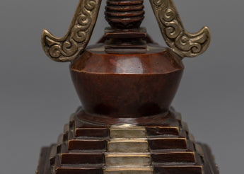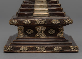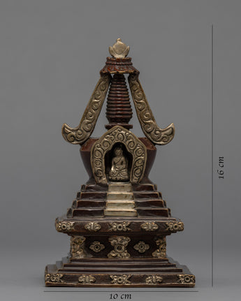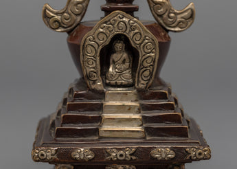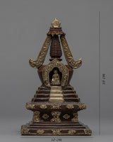 The stupa is an exceptional handmade creation that demonstrates the expertise and precision of skilled artisans. It is adorned with a Silver plated finish and features an intricately crafted statue integrated into the bumpa, showcasing meticulous attention to detail. The stupa symbolizes tranquility and enlightenment, and its refined design and silver coating make it a stunning addition to any home or meditation space. Moreover, the statue on the bhumpa adds an extra layer of spiritual significance to this exceptional piece. This stupa is an excellent way to infuse any environment with a sense of peace and serenity.