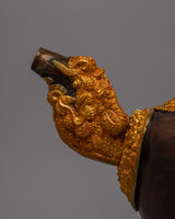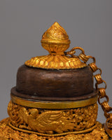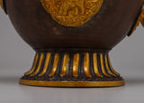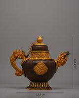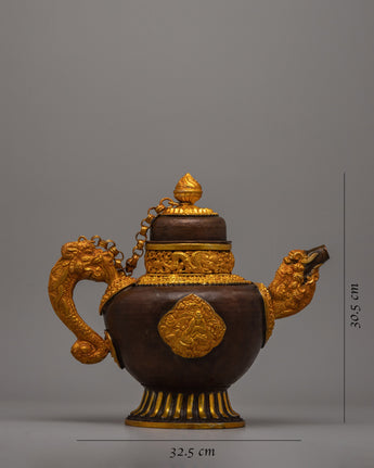 This 2.58 kg tea pot is a classic addition to any home or shrine because it is attractive and long-lasting. The symbolic themes instill a sense of devotion and calm, while the brilliant gold plating and intricate creativity will awe the viewer. This Tibetan Buddhist tea pot is a wonderful way to add a touch of holy tradition and spiritual energy to your room, whether it is used in rituals, displayed as a centerpiece, or given as a present to a loved one.