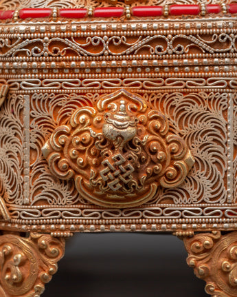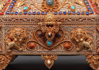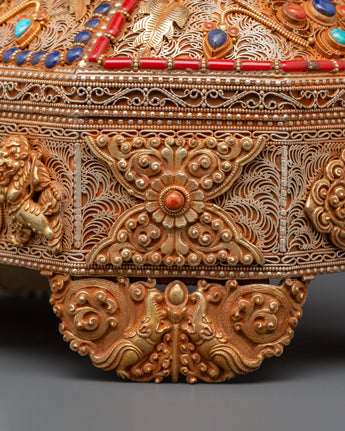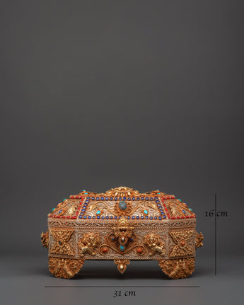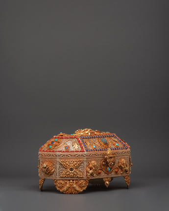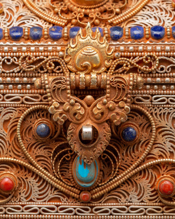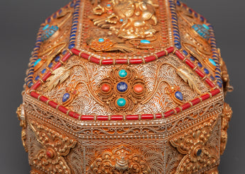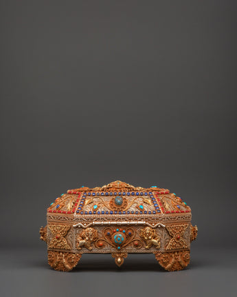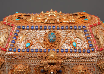 The Treasure box is made of copper and is beautifully gold-plated. It is delicately embellished with artificial turquoise and coral stones, which symbolize the sacred harmony of knowledge and compassion in Tibetan tradition. Detailed lion guards, floral designs, and protective symbols adorn every surface, showcasing exceptional artisanal skill and spiritual symbolism. Whether you're creating a shrine, following tradition, or collecting sacred art, this treasure box brings ageless beauty and religious significance to your surroundings.