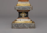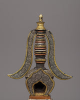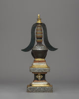 The flanking curved brass-inlaid ornaments give the structure a regal and divine aura, making it a focal point in any meditation or altar space. This Dharma Stupa, made with a combination of traditional Tibetan metallurgy and spiritual symbolism, is more than just a decorative piece; it is an effective representation of Buddhist teachings and cosmic order. The use of iron and copper ensures durability, while the silver and brass inlays add an opulent yet aged look. Whether displayed in a sacred setting or a personal collection, this stupa is a timeless reminder of spiritual devotion and the path to enlightenment.