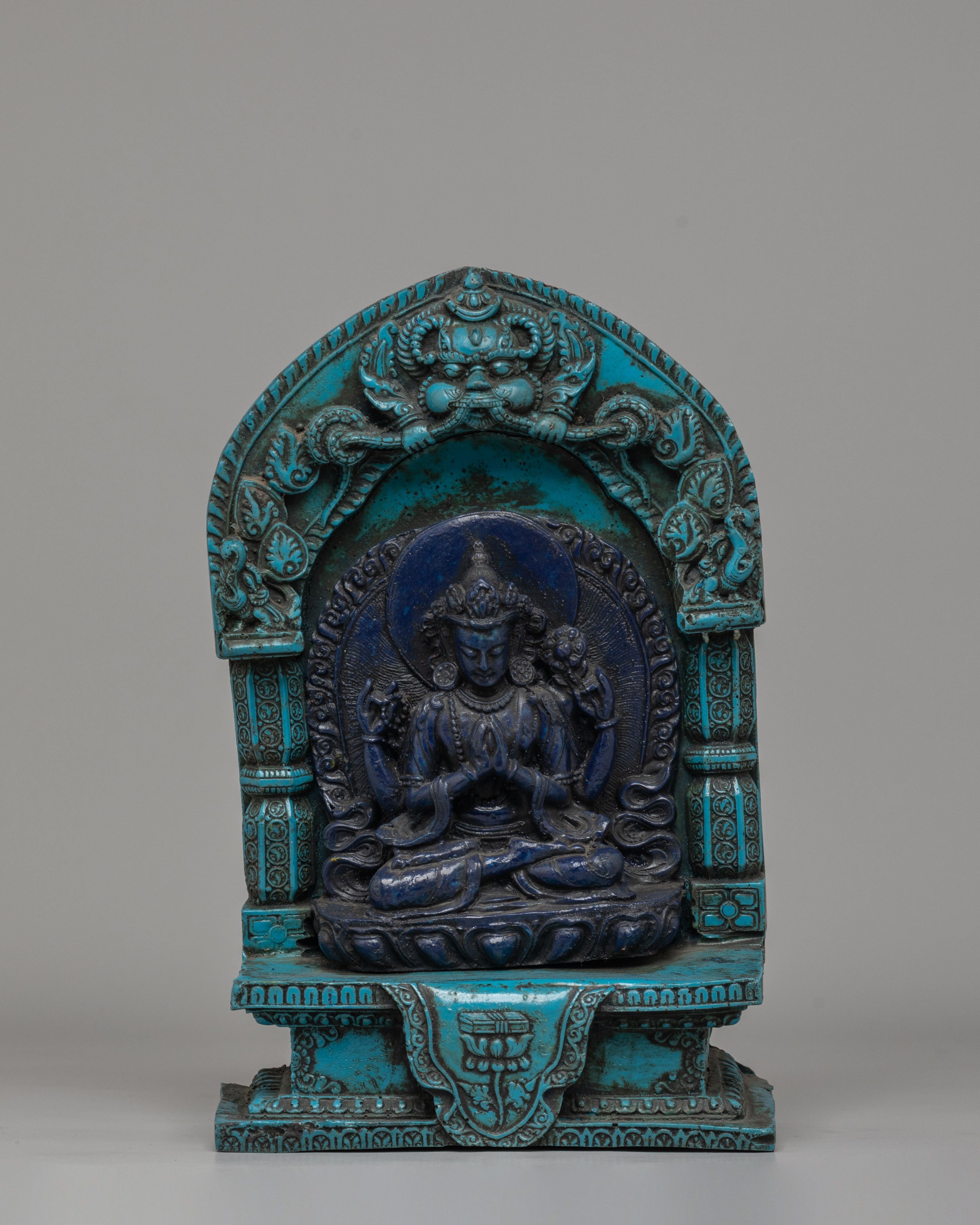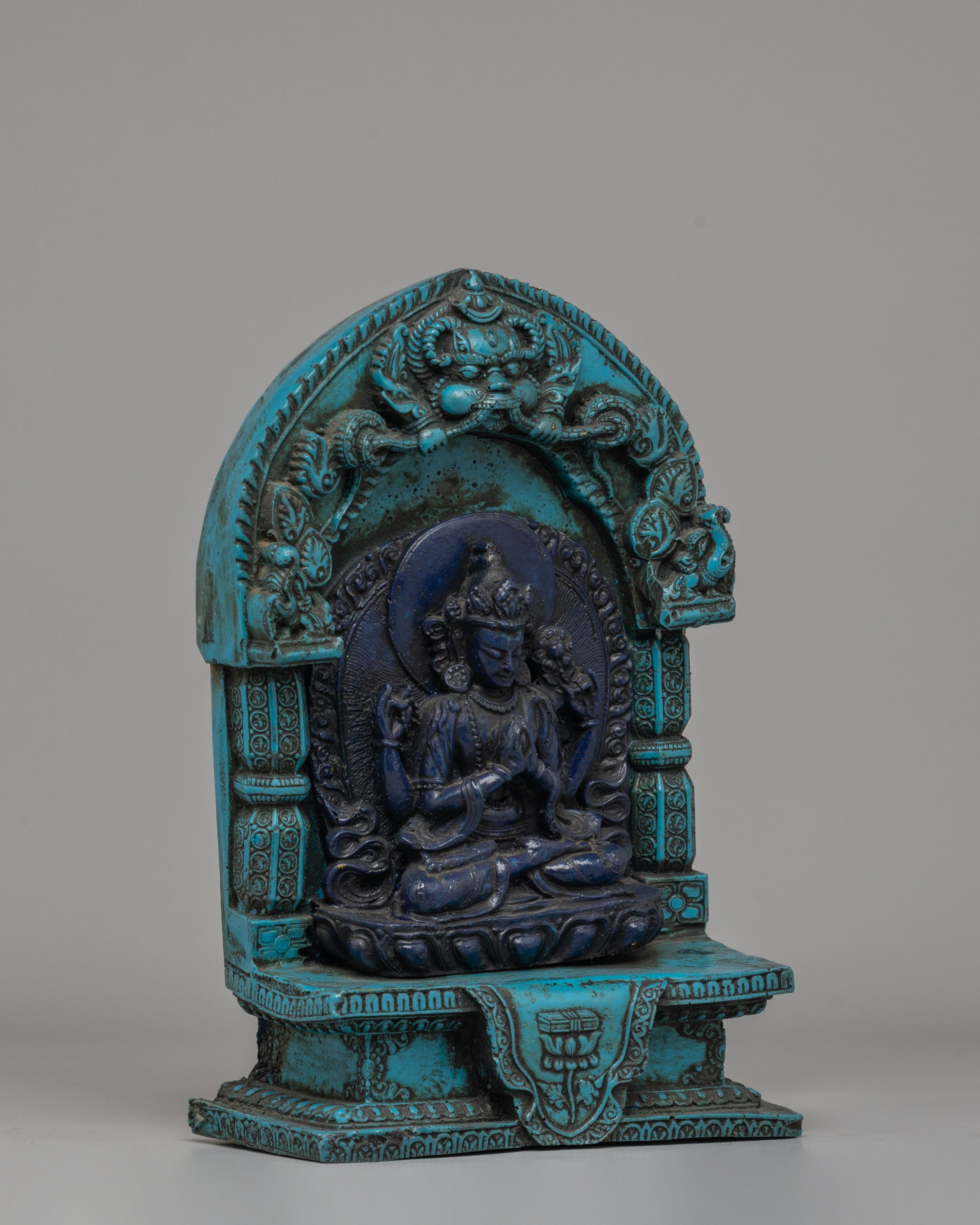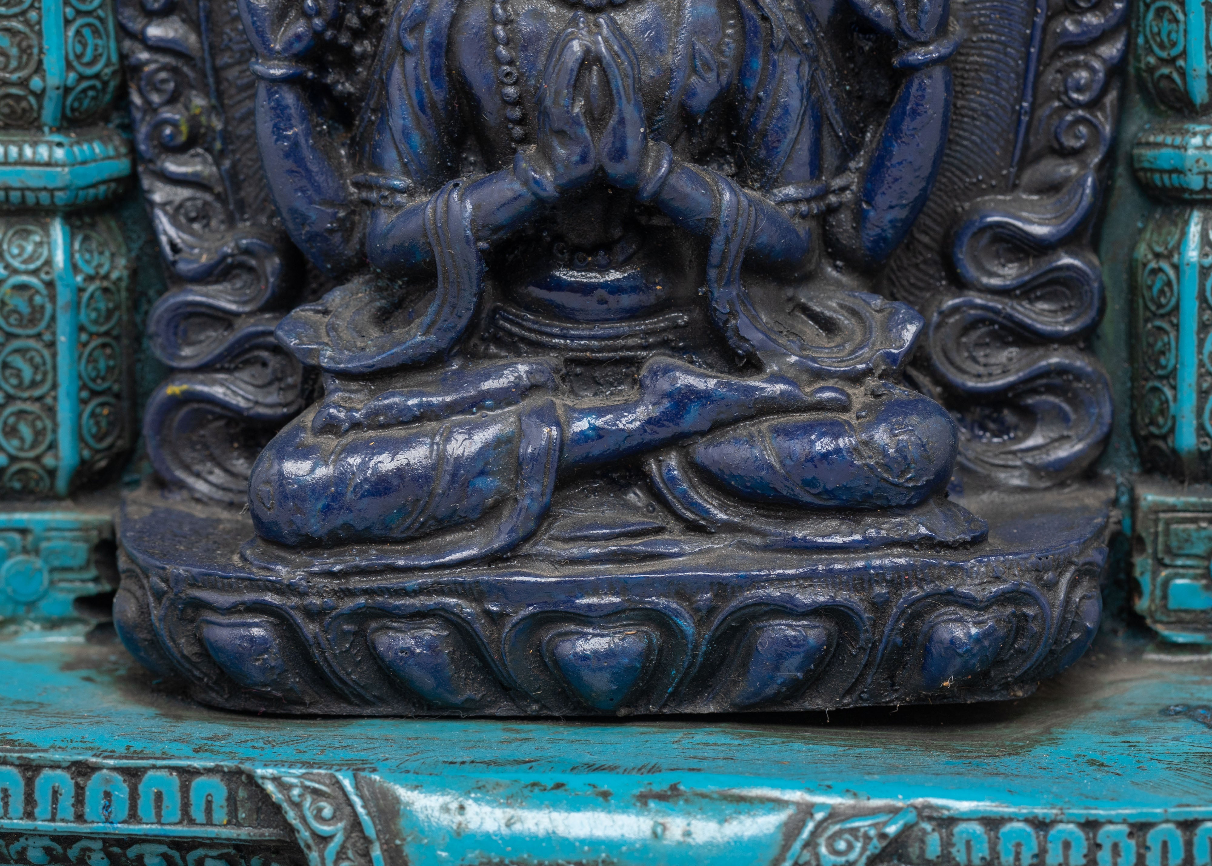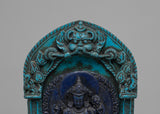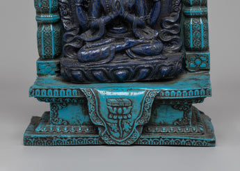 This intriguing statue depicts a serene Tibetan god sitting in meditation, exemplifying both peace and spiritual power. The god is intricately carved from dark blue material, representing wisdom and cosmic force, and the brilliant turquoise frame lends a feeling of balance and harmony. The deity's seated stance on a lotus throne depicts enlightenment emerging from the murky seas of ignorance, while the exquisitely detailed lotus petals emphasize spiritual purity. The figure's soft hand motions, known as mudras, represent meditation and imparting blessings. An magnificent gateway surrounds the deity, richly embellished with intricate patterns and legendary creatures, including a frightening guardian at the top, which represents protection and spiritual strength.
