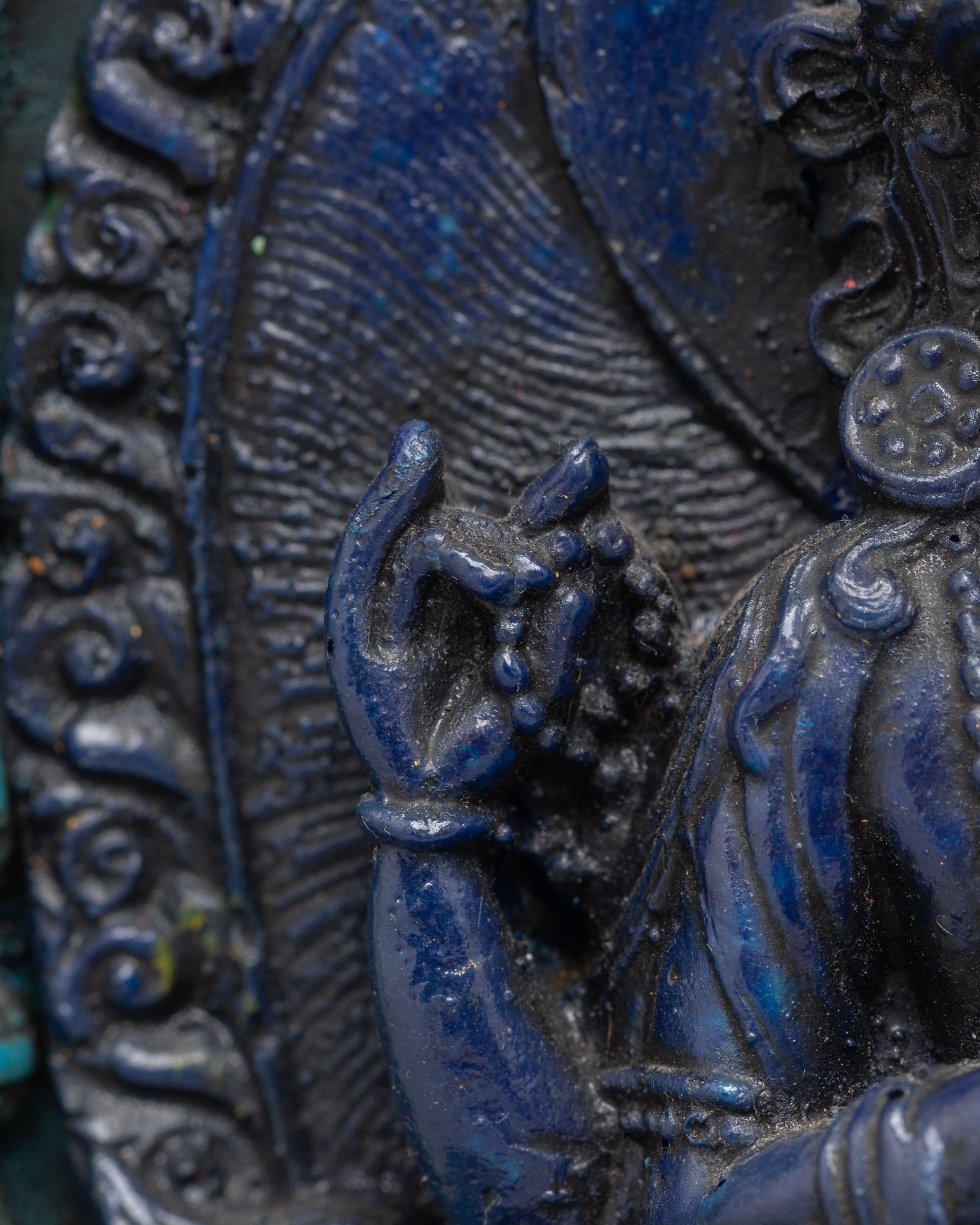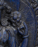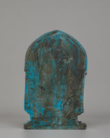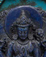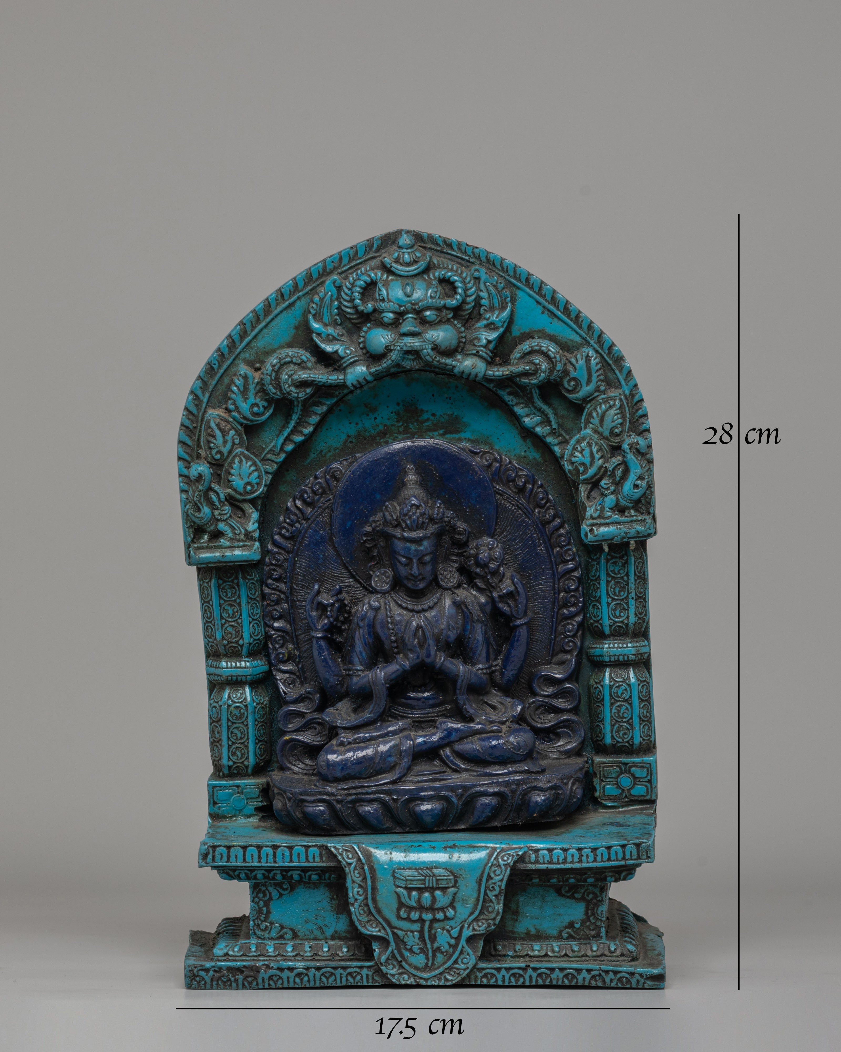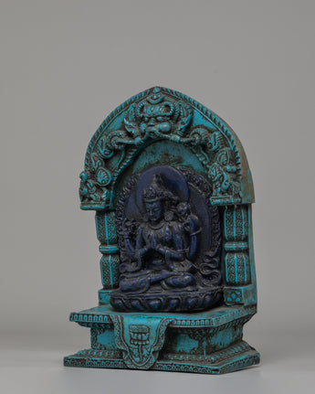 This intriguing statue depicts a serene Tibetan god sitting in meditation, exemplifying both peace and spiritual power. The god is intricately carved from dark blue material, representing wisdom and cosmic force, and the brilliant turquoise frame lends a feeling of balance and harmony. The deity's seated stance on a lotus throne depicts enlightenment emerging from the murky seas of ignorance, while the exquisitely detailed lotus petals emphasize spiritual purity. The figure's soft hand motions, known as mudras, represent meditation and imparting blessings. An magnificent gateway surrounds the deity, richly embellished with intricate patterns and legendary creatures, including a frightening guardian at the top, which represents protection and spiritual strength.