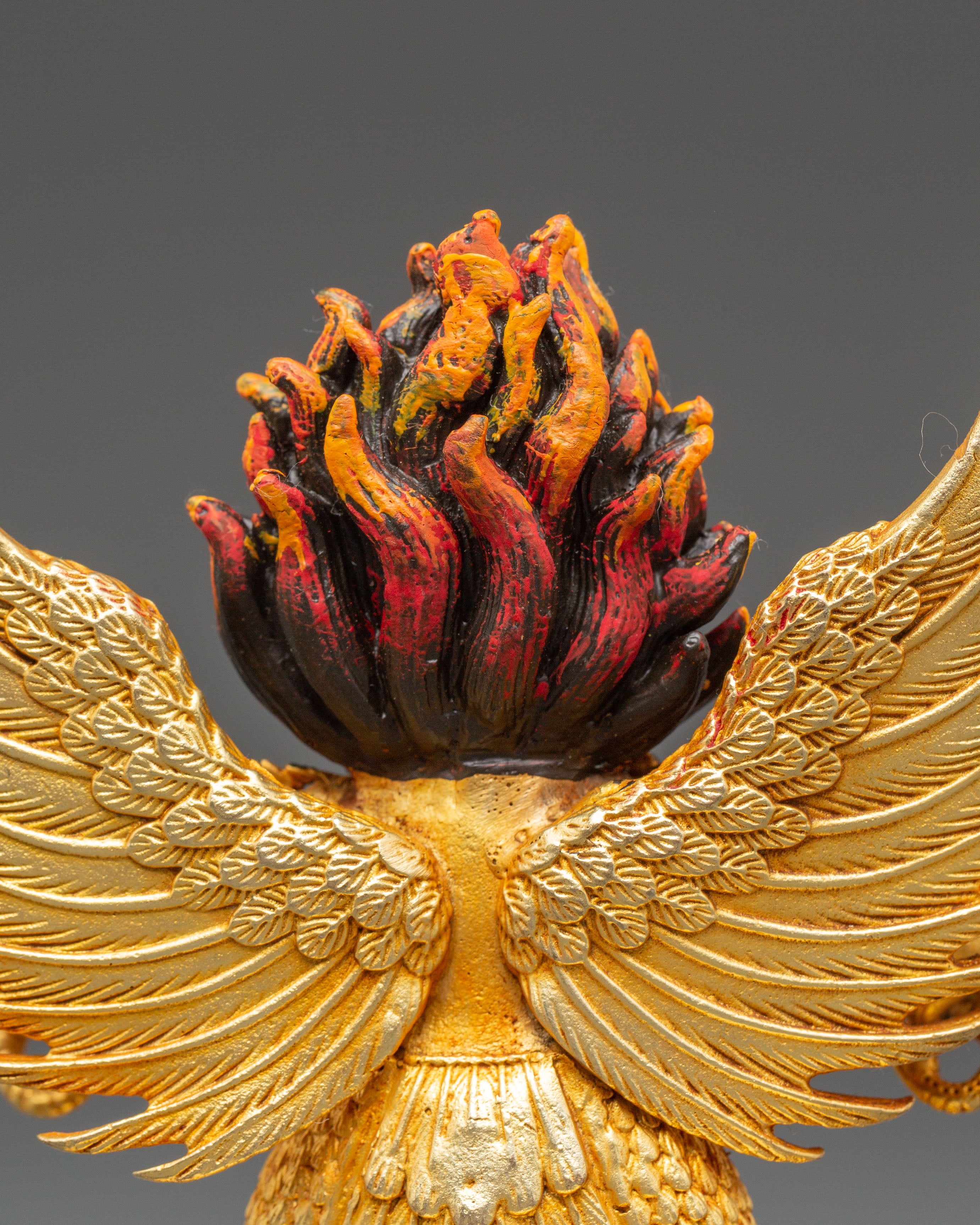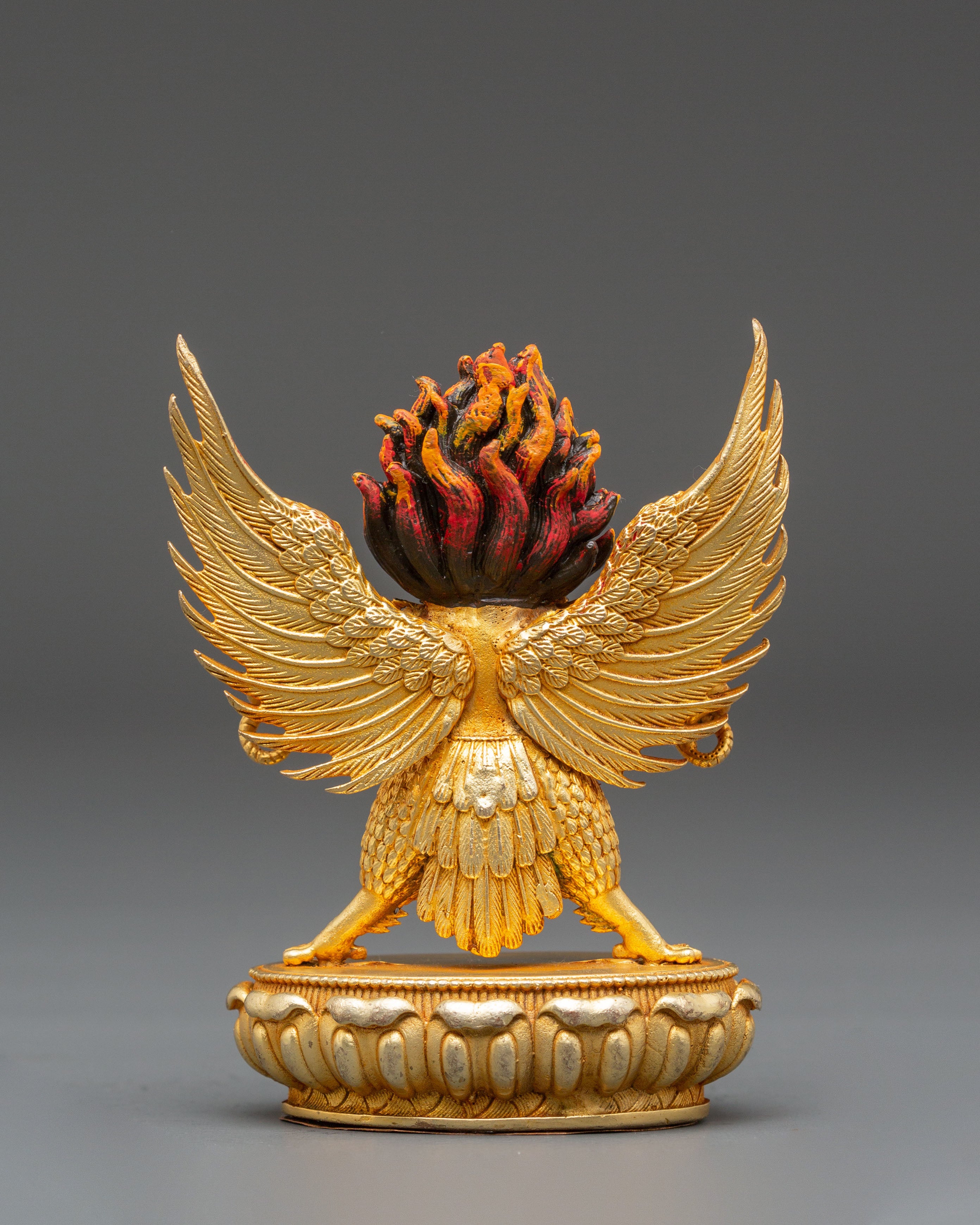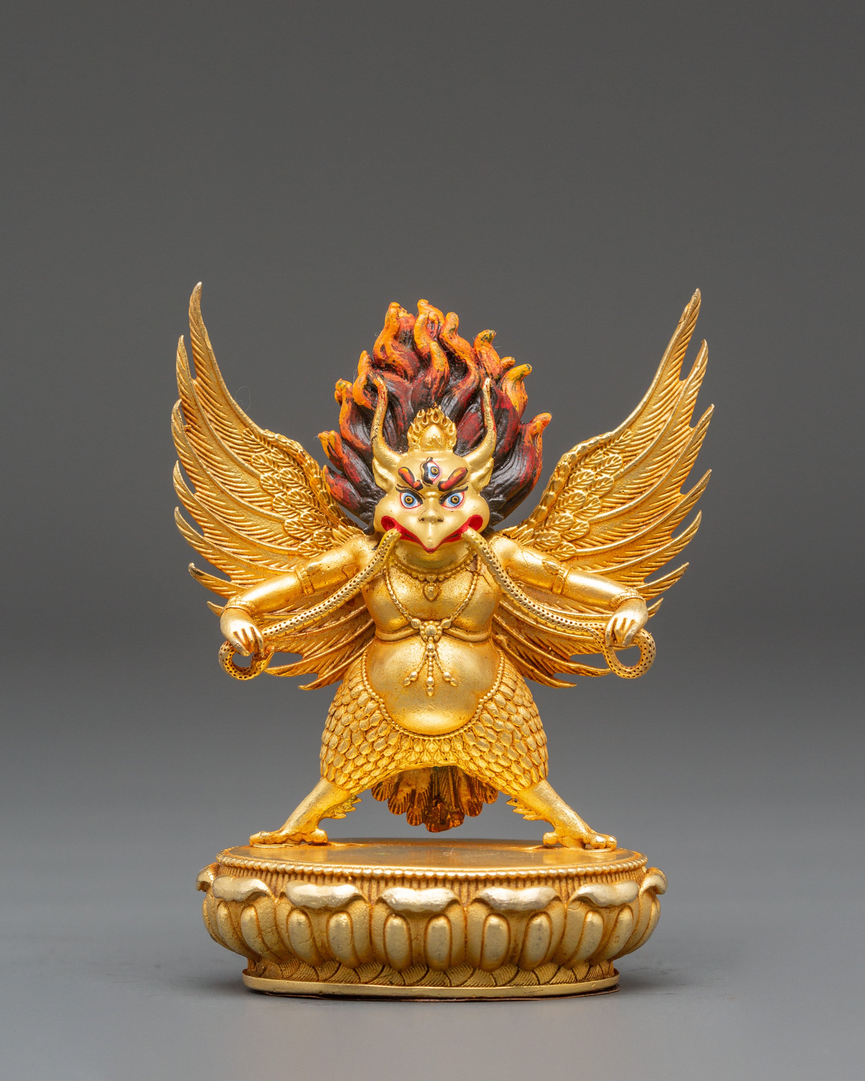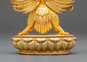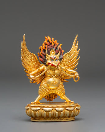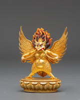 The sculpture depicts Garuda with majestic wings outstretched and a violent yet noble expression, expressing strength and determination. The burning crown above his head symbolizes heavenly energy and the transformational power of enlightenment. Every detail, from the textured feathers to the dynamic flow of his shape, embodies the spirit of Tibetan art. The lotus pedestal base symbolizes purity, while Garuda's upright stance and piercing gaze convey his role as a defender of truth and protector against negativity. The blazing glow surrounding him highlights his divine essence and everlasting strength.