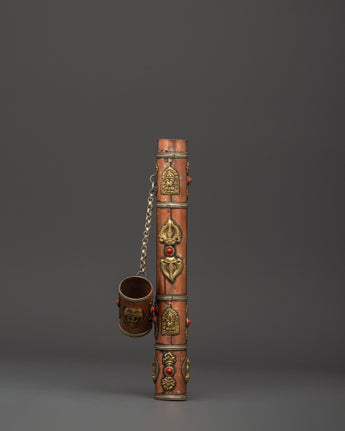 Coral inlays combined with copper and brass not only present attractiveness but also have symbolic significance. Coral symbolizes strength and energy, whereas copper and brass are valued in Tibetan tradition for their cleansing and protective qualities. The exquisite workmanship of Tibetan craftsmen is showcased by the incense holder's elaborate design, which includes complex brass designs and an elegant chain. Whether employed as a meditation aid or a piece of spiritual décor, this holder symbolizes calmness and strength.