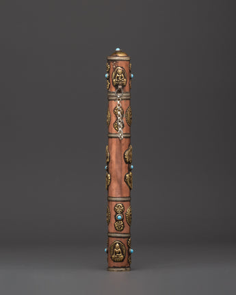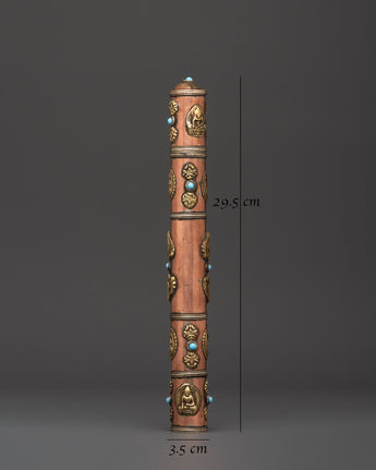 Immerse yourself in the peaceful surroundings of our Tibetan Incense Holder with Turquoise, an excellent combination of tradition and creativity. This handcrafted piece has stunning turquoise inlays and delicate brass designs, making it a lovely addition to any meditation room or spiritual shrine. This incense holder, 29.5 cm tall and 3.5 cm broad, is lightweight (0.12 kg), making it easy to set and use on many occasions.