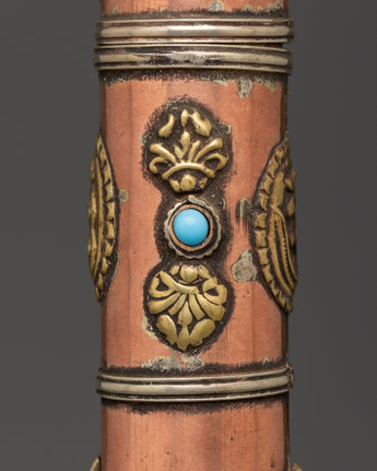 The traditional copper body of this incense holder symbolizes endurance, while the brass embellishments represent protection and spiritual power, adding to its antique charm. The turquoise inlays are typical of Tibetan workmanship, representing serenity and quiet. This holder exemplifies the harmonizing essence of Himalayan workmanship, making it perfect for burning incense during ceremonies or adding a religious touch to your décor. Its exquisite form and cultural significance make it an ideal present for spiritual practitioners and home décor devotees.