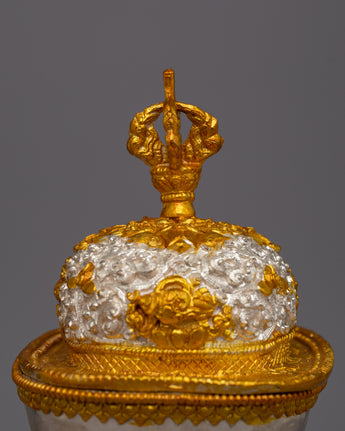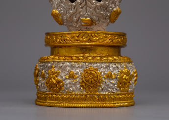 Presenting the Tibetan Kapala Skull Cup Set, an exquisitely made set that perfectly captures the spiritual legacy and extraordinary creativity of Tibetan handicraft. Each item in this set has a copper body and is plated in electro gold and silver. It weighs 1.588 kg overall and is 22.5 cm in height and 10 cm in breadth. The elaborate patterns and fine craftsmanship are a reflection of the kapala's profound cultural and spiritual significance. The kapala is a traditional emblem of the impermanence of life and the transformation of negative forces in Tibetan Buddhist rituals.