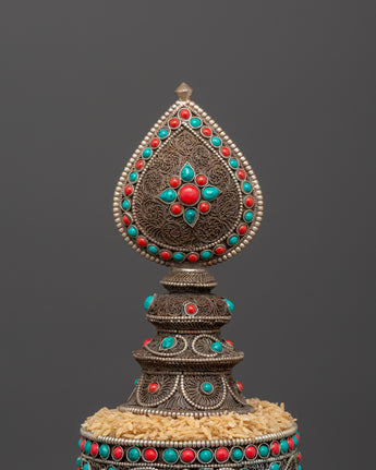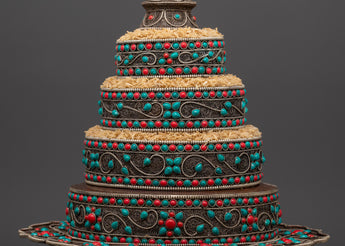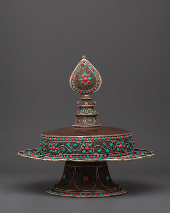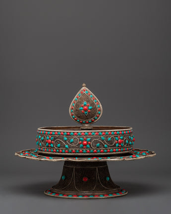 This gorgeous Tibetan Mandala Offering Set, a significant, handcrafted ritual item crafted from oxidized copper and silver plating, and embellished with Artificial coral and turquoise stones, will add sacred beauty and spiritual meaning to your home. Standing 43 cm tall, this mandala set is utilized in Tibetan Buddhist rituals that represent all of creation as a devotional and merit offering.