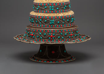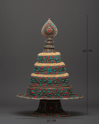 This intricately made mandala, with tiered levels and beautiful filigree, is more than just décor; it's a profound spiritual symbol. This item is ideal for altars, temples, and sacred spaces, as it is used in mandala offerings to gather merit and ward off negativity. The attractive stones signify knowledge, compassion, and abundance, while the structure reflects the various layers of the world that are available to enlightened individuals. The vast foundation and fine craftsmanship make it both a spiritual and visual focal point.