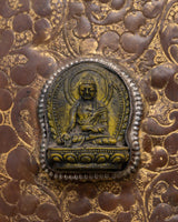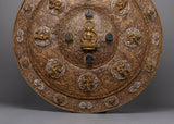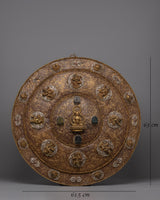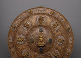 This Tibetan Metal Thangka Wall Hanging with Copper Body, Silver, and Gold Plating is an incredible piece of Tibetan Buddhist art. It is 63 cm in height, 61.5 cm in width, and weighs 5.27 kg, with elaborate hand-carved elements that highlight its spiritual and spiritual worth. The primary picture is a calm Buddha seated on a lotus foundation, representing enlightenment, purity, and spiritual awakening. Surrounding the Buddha are continuous circular designs with protective deities, floral concepts and symbolic patterns that depict the universe' harmony and balance.