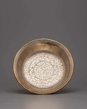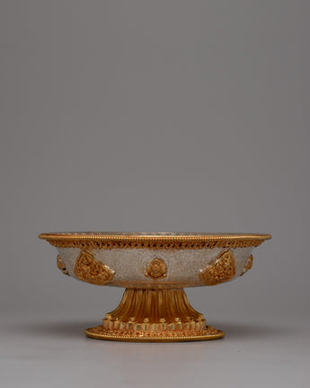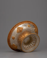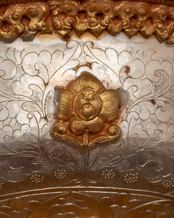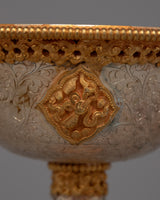 The core of devotion and spiritual practice in Tibetan Buddhist traditions is embodied in the Tibetan Offering Serkyem Set. This set is elegant and dignified, with its copper body expertly crafted and richly detailed with 24k gold and silver plating. All the pieces in the set have symbolic meaning; they are offerings given to enlightened beings in order to gain merit and promote spiritual development.