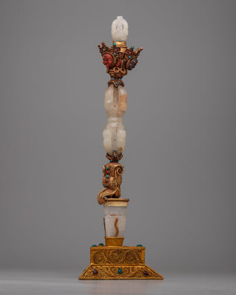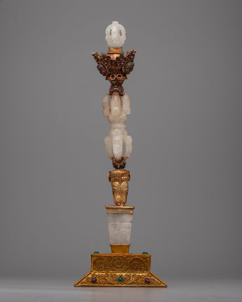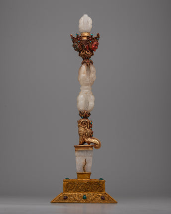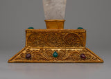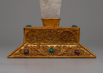An essential component of Tibetan Buddhist ceremonies, the phurba represents the defeat of evil spirits and the elimination of barriers. Its spiritual resonance is increased by the addition of several valuable stones, including Panna for wisdom, lapis lazuli for insight, crystal for clarity, ruby for passion, and turquoise for protection. The phurba's delicate details and sparkling beauty are highlighted by the electro-gold plating, which gives a bright finish, and the accompanying stand, which offers a stable and elegant foundation.