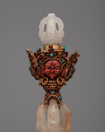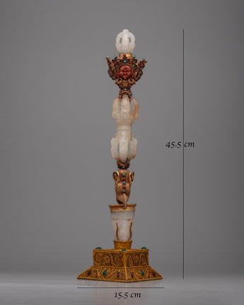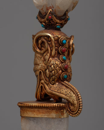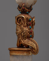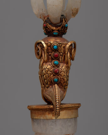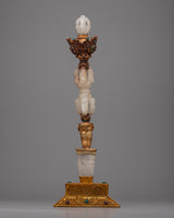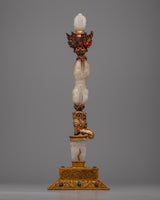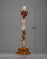 Presenting the Tibetan Phurba with Stand, a unique combination of fine craftsmanship and spiritual importance. This exquisite phurba, handcrafted on a copper body and electroplated in gold, is embellished with various priceless stones, such as Panna, crystal, ruby, lapis lazuli, turquoise, and coral. At 45.5 cm in height, 15.5 cm in width, and 1 kilogram in weight, it is a gorgeous and profoundly symbolic sculpture.