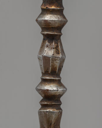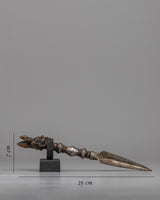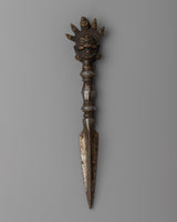 Beautifully carved from oxidized copper, the Tibetan Phurba Ritual Dagger showcases the profound cultural and spiritual significance of this traditional instrument. Often utilized in Tibetan rites and ceremonies, the phurba represents empowerment and protection as well as the capacity to overcome adversity. The dagger's distinct, archaic aspect, enhanced by its oxidized finish, adds to its ethereal quality.