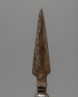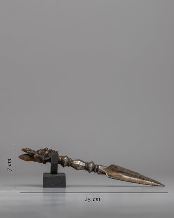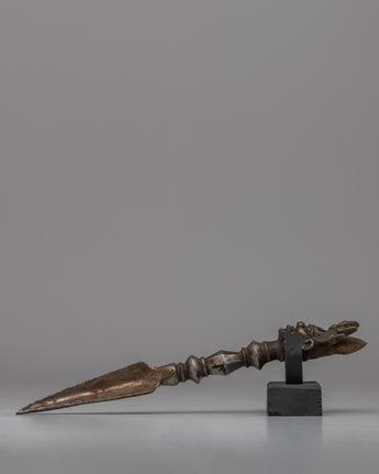The base that comes with this phurba makes it easy to display when not in use. The dagger is both an elegant ornamental piece and a useful ritual tool because of the fine embellishments on both the blade and handle, which demonstrate the expert craftsmanship that went into its construction. A significant addition to any collection devoted to Tibetan Buddhist practices, the Tibetan Phurba Ritual Dagger is perfect for meditation areas or altars. It is a potent emblem of change and spiritual strength.