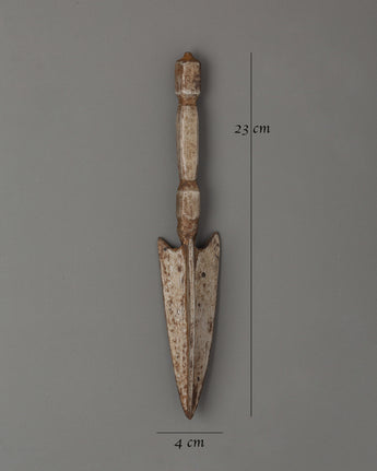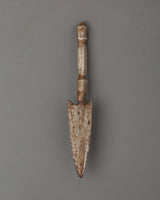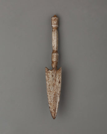 The Tibetan Phurba Ritual Item is a sacred ceremonial instrument symbolizing protection, transformation, and spiritual purification. This ritual dagger, measuring 23 cm in height and 4 cm in width, weighs 0.21 kg and is expertly crafted from iron. The Phurba has been used in Tibetan Buddhism and various spiritual traditions to dispel negative energy, cleanse spaces, and transform harmful influences into positive forces. The Tibetan Phurba features intricate designs that embody the union of wisdom and compassion and the capacity to cut through the illusions and ignorance that hinder spiritual progress.