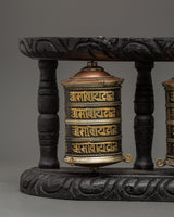 This prayer wheelset is compact and substantial, measuring 15 cm in height by 33 cm in width and weighing 0.81 kg. The brass and copper wheels, together with the well made hardwood frame, give it a classic and elegant look. Whether used for meditation, spiritual practice, or as a beautiful centerpiece, this prayer wheel set will boost the energy in your room, providing a sense of peace, balance, and spiritual harmony.