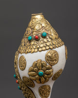 This Tibetan Ritual Conch Shell (Shankha) has a wonderfully carved brass inlay over a conch shell adorned with artificial turquoise and coral stones. This ceremonial piece is 13 cm tall, 28.5 cm wide, and weighs 0.91 kg. It is rich in spiritual significance and artistic depth. The intricate artwork incorporates auspicious themes, flower mandalas, and the Dharma symbol, making it both a spiritual instrument and a decorative ritual item.