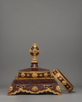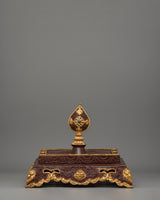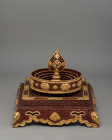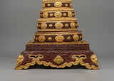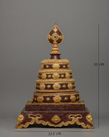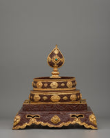 This magnificent Tibetan Ritual Offering Mandala Set is a spiritual masterpiece, designed for profound Buddhist practices and ceremonial offerings. Standing 55cm tall, 35.5cm wide, and with a 20cm mandala tier, this sacred set displays presence and holiness, making it an ideal focal point for any home shrine, monastery, or temple. The structure is made of copper and generously gold-plated, with engraved designs of religious symbols on each layer, representing the universe in its most plentiful and completed condition.