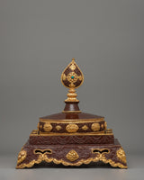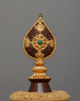 The mandala is delicately made on a wonderfully crafted pedestal base, emphasizing its aesthetic and symbolic significance. The delicate goldwork accentuates auspicious motifs reminiscent of traditional Tibetan workmanship. This mandala is utilized in Vajrayana ceremonies to represent the giving of the entire universe to enlightened beings.