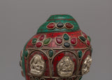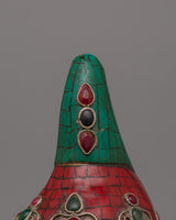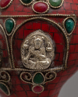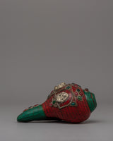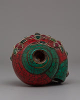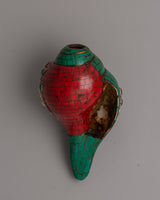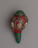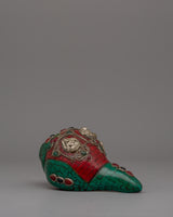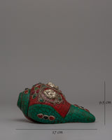 This wonderfully carved Sankha showcases the eternal beauty of Tibetan handicrafts. This holy conch shell is made of copper and electro-silver plated. It is further ornamented with colorful imitation coral and turquoise stones. These magnificent intricacies provide a harmonic combination of elegance and tradition, making this Sankha an excellent choice for spiritual events, meditation rooms, or a one-of-a-kind decorative centerpiece. It is 9.5cm in height and 17cm in breadth, is tiny and lightweight (weighing only 0.67kg), and exudes refinement and cultural richness.