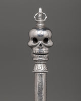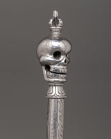 This scepter, known as Khatvanga, is a revered implement in Tibetan Buddhism and spiritual practice. Its skull and crown iconography heightens its mystical importance, representing impermanence and might. This Tibetan Khatvanga scepter is ideal for meditation areas, ceremonial activities, or as a significant souvenir. It is a strong reminder of the journey to enlightenment and spiritual awakening.