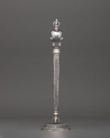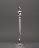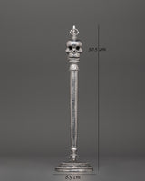 The Tibetan ritual tool, the scepter Khatvanga, is a precious spiritual instrument crafted with remarkable skill from iron. This magnificent sculpture stands 30.5 cm tall, is 8.5 cm wide, and weighs 0.86 kg, making it a sturdy and durable addition to any ritual or spiritual collection. The scepter features a unique design with a skull-crowned handle, symbolizing the duality of life and death in Tibetan philosophy. It is employed in various spiritual practices, embodying the blend of knowledge and compassion, and is often used by practitioners for meditation, ceremonies, and sacred offerings.