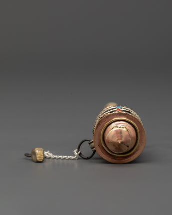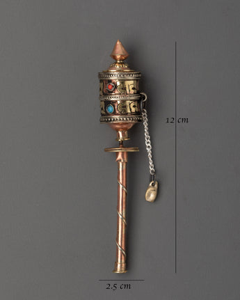 This portable and easy-to-use prayer wheel weighs only 0.016kg and is suitable for both personal meditation and ceremonial use. The inscribed sacred mantras connect the practitioner to ancient teachings, making each spin a spiritual act of devotion. Copper and brass metals represent purity and power, while turquoise adds protective energy and ancient Tibetan symbolism. An excellent spiritual tool for altars, everyday rituals, or as a gift for individuals on their spiritual journey.