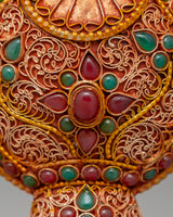 This traditional snuff container serves as both a useful and a one-of-a-kind work of art. Its handcrafted design, rich copper body, and colorful gemstone accents make it a cherished property among Tibetan artifacts and Himalayan art enthusiasts. Ideal for people who value spiritual design, this piece's cultural importance and craftsmanship elevate any home.