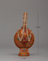 The Tibetan Snuff Bottle is an excellent example of Himalayan craftsmanship, with a copper body and elegant gold-plated filigree work. This handcrafted Tibetan decor piece is adorned with delicate coral and turquoise stones, exuding traditional elegance and spiritual symbolism. It measures 16 cm tall and 8 cm wide, making it an ideal addition to any collection or display.