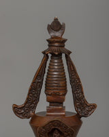 This Tibetan Stupa Artwork is an example of Tibetan craftsmanship, made of oxidized copper. Standing 24 cm tall and 11.5 cm wide, this piece is the perfect size to make a statement while fitting easily into various spaces. The oxidized copper body adds to its historical significance, capturing the essence of Tibetan art and spiritual symbolism.