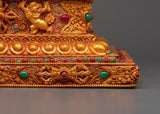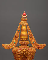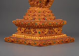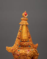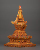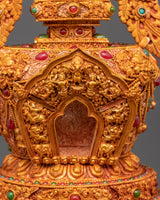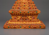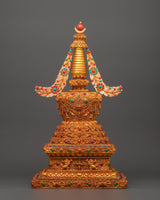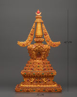 This stunning Tibetan stupa with coral, created from a copper body and incredibly gold-plated for divine brilliance, allows you to immerse yourself in spiritual beauty. This revered 47-cm-tall stupa, adorned with delicately inset artificial coral and blue stones, symbolises enlightenment, wisdom, and tranquillity. In Tibetan Buddhism, stupas traditionally symbolise the Buddha's enlightened mind, house sacred artefacts, and act as centres for meditation and sacrifices.