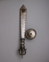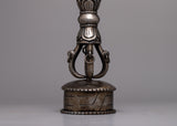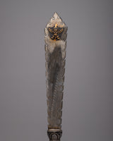 Ritual tools are vital equipment of Tibetan Vajrayana Buddhism practice, meant to dispel misconceptions that obstruct enlightenment. The phurba (Sanskrit: Kila) blade seen here was created to symbolically swallow the three poisons that obstruct spiritual progress: ignorance, greed, and illusion. The Phurba is the physical manifestation of the Vajrakila Buddha, who has the ability to destroy all evil on the earth. Its ceremonial usage is first recorded in the Vajrakilaya Tantra, an eighth-century or older Vajrayana work.