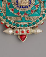 The Tibetan Treasure Box "Ghau" is a masterfully constructed piece that combines exquisite design with spiritual meaning. This box, which measures 13 cm in height and 10.5 cm in width, is composed of copper and has been electroplated with silver to add beauty. The intricate filigree work demonstrates the outstanding expertise of traditional Tibetan craftspeople, while the use of genuine turquoise, coral, and lapis lazuli stones provides brilliant color and symbolic importance. These stones are said to provide protection, healing, and spiritual energy, making the Ghau both a visual marvel and a valuable spiritual treasure.