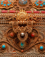 Traditionally used for storing ritual objects, relics, or precious offerings, this handcrafted Tibetan Treasure Box with turquoise and coral represents sacred Himalayan creativity. It is made of a copper body and is exquisitely plated in gold and silver. It is 17 cm tall, 33 cm wide, and weighs 2.86 kg. It exudes elegance and spiritual meaning.