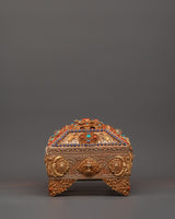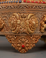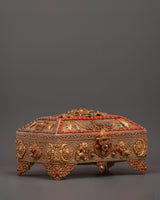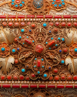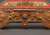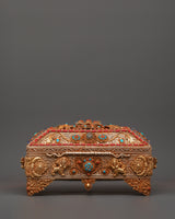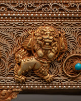 The box is adorned with genuine turquoise and coral stones, symbols of healing and protection in Tibetan culture. Intricate filigree work, floral motifs, and regal snow lion figures enhance its presence, with each detail handcrafted to reflect divine energy and strength. The elevated base and ornamental lid give it the aura of a sacred shrine artifact, perfect for functional and decorative use.