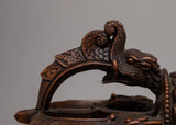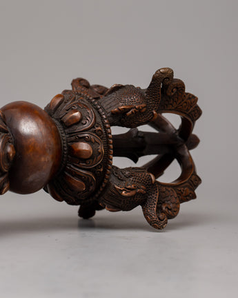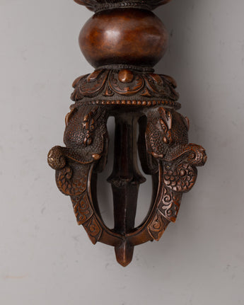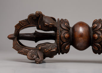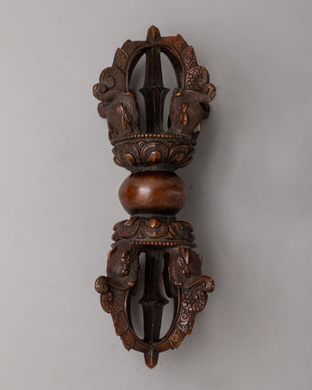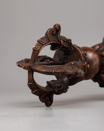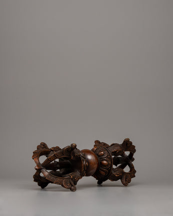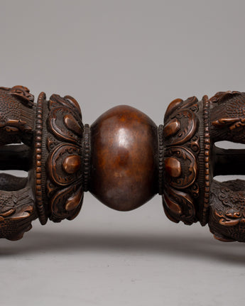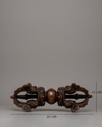 The Tibetan Vajra Dorje allows you to immerse yourself in ancient Tibetan spiritual understanding. Handmade with painstaking care on an oxidized copper body, this sacred instrument has a solid body that radiates strength and longevity. It stands 11 cm tall, 30 cm wide, and weighs 4.78 kg, making it an interesting focus point in your spiritual practice.