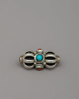 The Tibetan Vajra Locket is a small but exquisitely designed spiritual piece representing strength, protection, and the indestructible nature of enlightenment. This intricately crafted locket, measuring 1.8 cm in length and 0.8 cm in height, is made of silver and has vivid turquoise and coral inlays.
