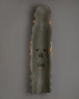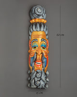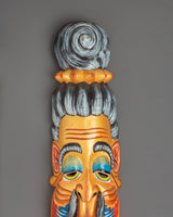 This handcrafted Tibetan wall hanging mask is a stunningly intricate work of traditional art, skillfully carved from wood and painted in incredible acrylic colors. This remarkable mask, which measures 60 cm in height and 15 cm in width and weighs 1.050 kg, is ideal for use in spiritual areas, meditation rooms, or Tibetan-themed design. The vibrant colors and elaborate patterns depict a spiritual figure from Tibetan culture, serving as both a beautiful piece and a mark of historical significance.