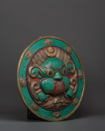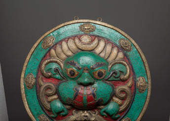 This stunning Tibetan wall hanging with turquoise, a handcrafted sacred decoration with gorgeous turquoise and coral inlays on a silver-plated copper body, will elevate your spiritual surroundings. The Lion, a timeless symbol of bravery, knowledge, and protection in Tibetan culture, is powerfully depicted in this artwork. This wall hanging is both a beautiful work of Himalayan art and a spiritual shield due to its striking gaze and intricate workmanship.