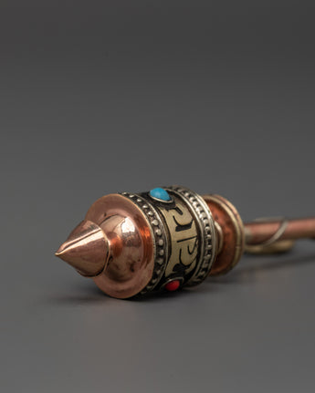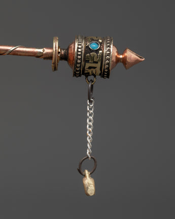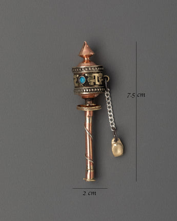 This Traditional Buddhist Prayer Wheel, measuring 7.5 cm in height and 2 cm in breadth and weighing around 0.010 kg, is made of copper or brass and decorated with artificial turquoise stones. These prayer wheels are spiritual tools used in Tibetan Buddhism to gain wisdom and merit, as well as to eliminate negativity, by spinning the wheel, which is frequently inscribed with the mantra "Om Mani Padme Hum" and packed with mantras.
