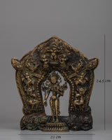 Traditional Buddhist Standing Tara Statue is an excellent item with a durable brass body that demonstrates fine craftsmanship and attention to detail. With a height of 24.5 cm, a width of 23 cm, and a weight of 1.49 kg, this figure represents reverence and devotion in Buddhist practice. The choice of brass ensures endurance and adds an antique appeal, making it a great object for both spiritual and decorative uses. The statue has great religious significance, acting as both a focal point for meditation and an outlet for creating Tara's blessings.
