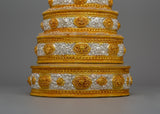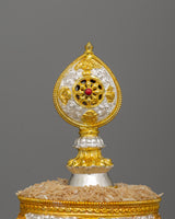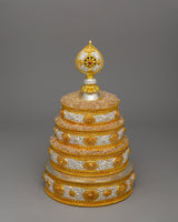 Traditional Mandala Offering Set Artwork is skillfully created from copper and plated with brilliant electro silver and gold layers. This offering set, which measures 32.5cm in height and 18.5cm in breadth, makes an eye-catching centerpiece for any sacred area or Buddhist altar. It embodies the essence of Tibetan ceremonies, which are used to create spiritual gifts to Buddhas and Bodhisattvas, who represent the entire cosmos.