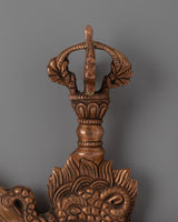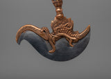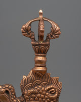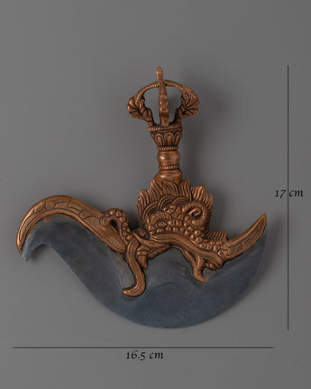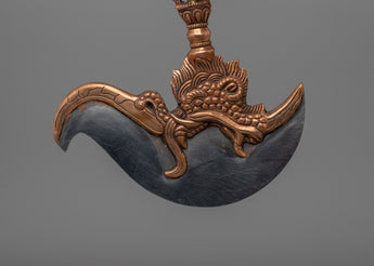 The iron blade represents power and accuracy, while the copper body provides a touch of refinement and classic beauty. The Kartika Knife, which symbolizes the wisdom that pierces the darkness of attachment and delusion, is a sacred instrument used in Tibetan Buddhism rituals to cut away ignorance and the ego. It is both a powerful spiritual tool and an eye-catching ornamental element due to its sharp, curved blade and intricately detailed design. This Kartika Knife is more than simply a tool; it is a representation of the transforming power of wisdom and enlightenment, and can be used for ritual purposes, meditation practice, or as an unique addition to your collection of spiritual objects. With this outstanding item, you may bring the spirit of Tibetan Buddhist culture into your home.