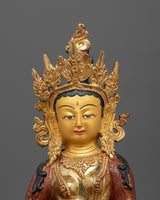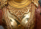 The Traditional Sculpture of the Ksitigarbha stands at a height of 13.2 inches (33.5 cm) with a base width of 9.4 inches (24 cm) and weighs 3.02 kg. Crafted with an Oxidized copper body, it is adorned with a luxurious 24K gold-gilded finish.  Intricate gold and acrylic paintings further embellish the statue, highlighting its detailed craftsmanship and rich artistic value. This beautifully handcrafted statue is perfect for collectors, spiritual practitioners, or as a unique addition to any home decor, radiating both elegance and spiritual significance.