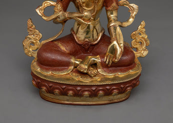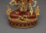 The Bodhisattva wears an elaborate crown, symbolizing spiritual authority and enlightenment. Jewelry and adornments signify her divine status and transcendence of worldly attachments. And is seated on a lotus pedestal, symbolizing purity and detachment from the material world. A serene and compassionate expression reflects the Bodhisattva's enlightened state and boundless compassion.